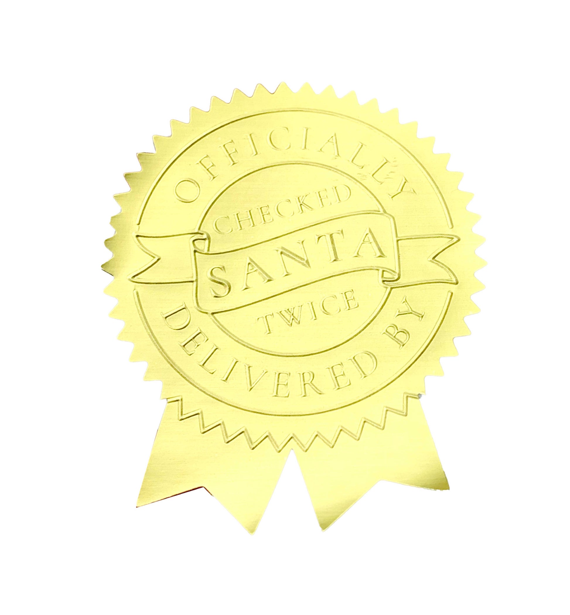 Authenticate the delivery of your gifts from the North Pole with these 'Delivered by Santa' embossed rosette-shaped stickers.