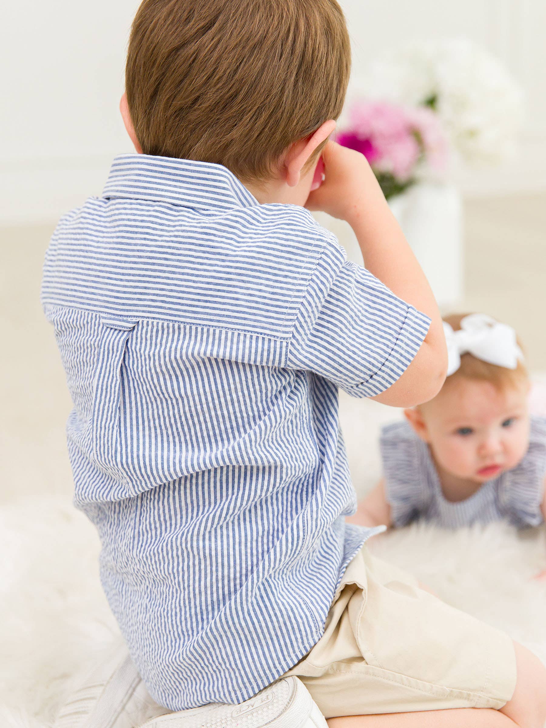 Boys Classic Blue Seersucker Short Sleeve Button Down Shirt