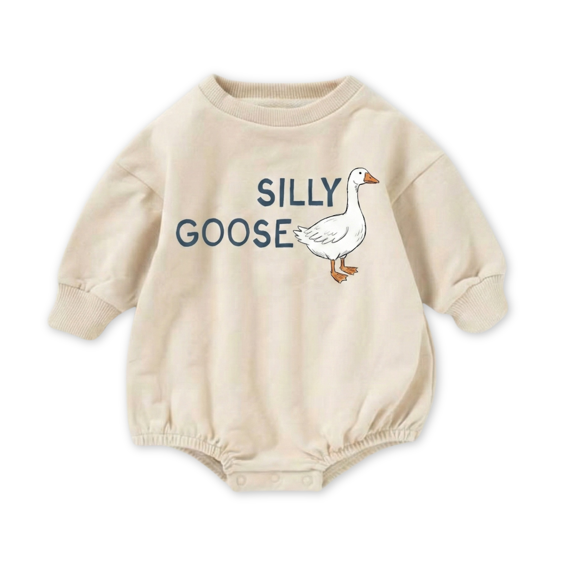 A cheeky bubble romper featuring a playful goose graphic. Full of personality and easy to sell as a standout everyday piece.