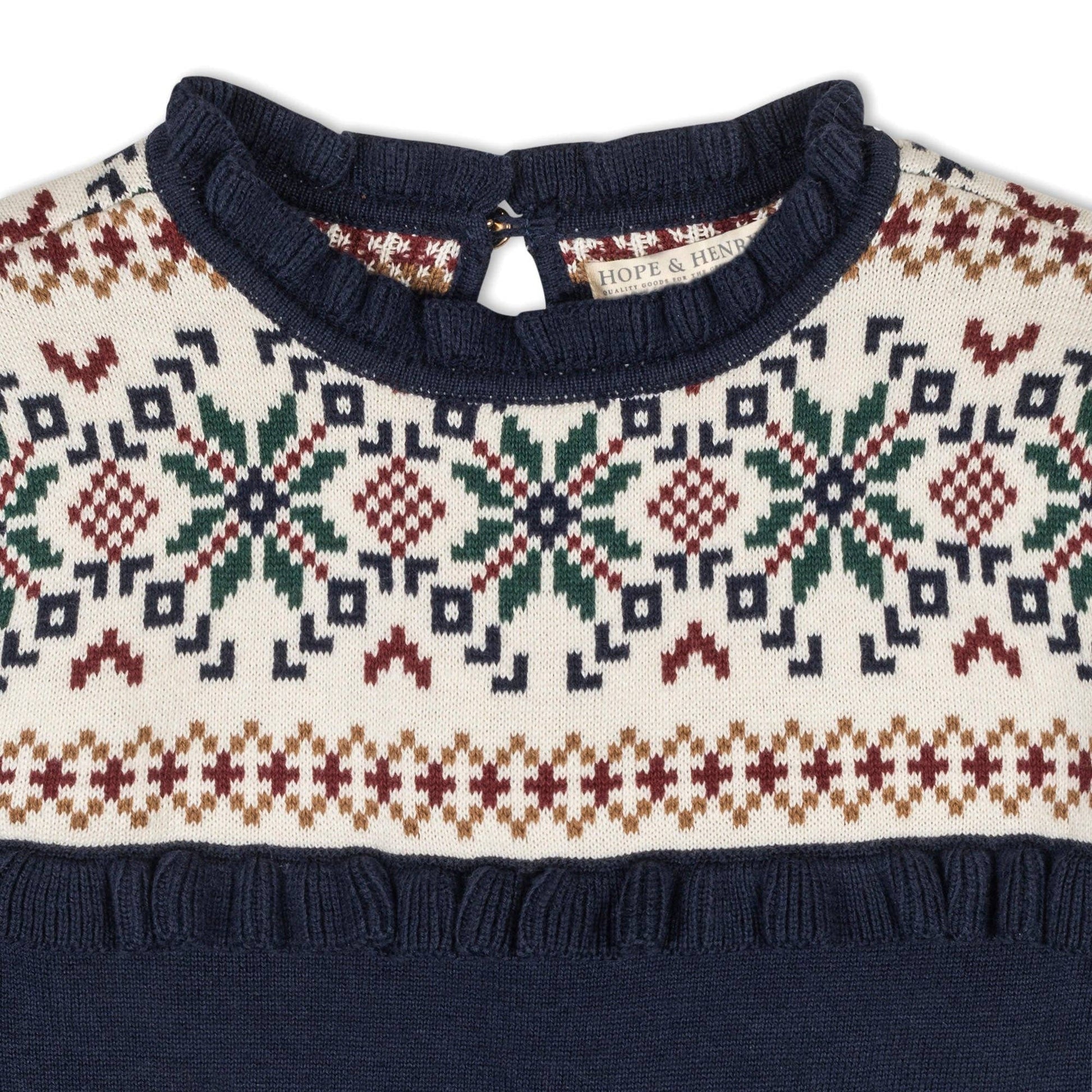 This beautiful piece combines the polish of a dress with the comfort of her favorite sweater (aka the best of both worlds). Features a ruffle collar, a festive fair isle yoke design, and a bow detail at the waist. A special piece in soft organic cotton she will treasure this season.