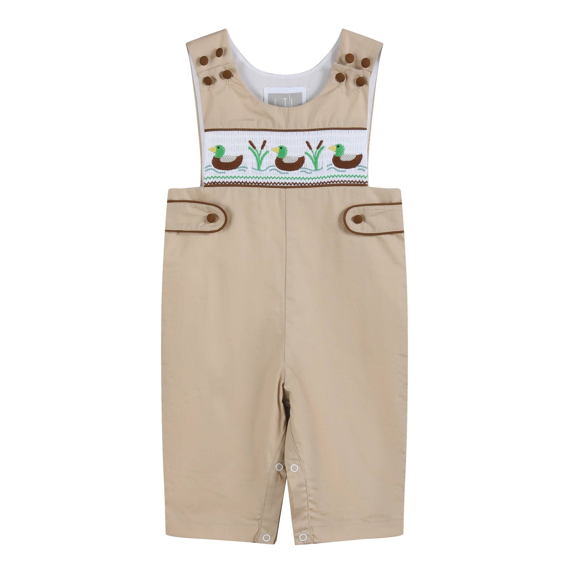 Dress your little adventurer in adorable style with our Light Brown Mallard Smocked Overalls. The smocked panel, featuring charming embroidered ducks, adds a playful touch to these versatile overalls. In classic light brown color, these overalls are not only cute but also comfortable, making them the perfect choice for your little one's everyday explorations.