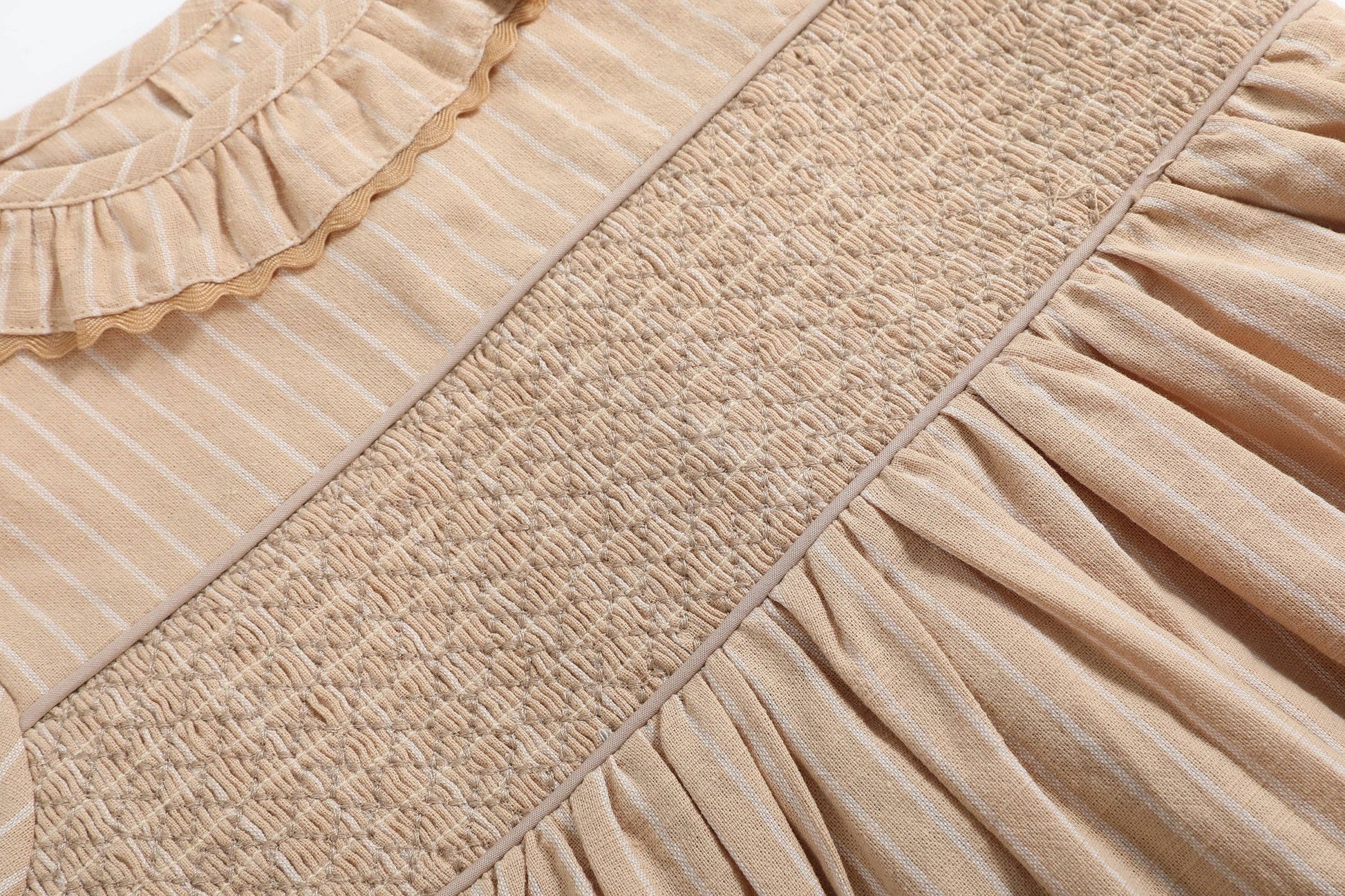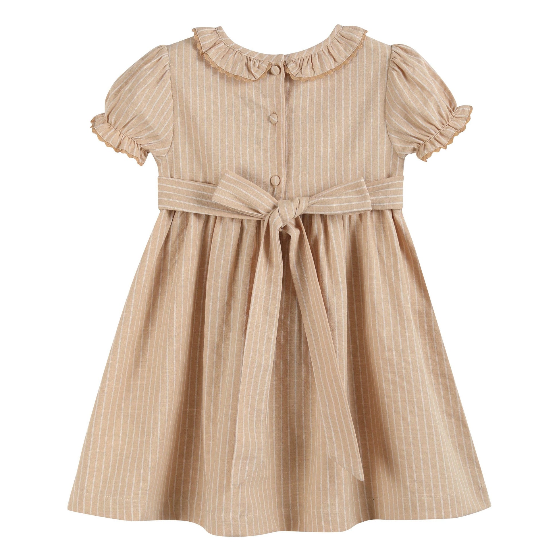 Let your sweet girl dress to impress in this Light Brown Smocked Ruffle Dress! The smocked chest adds classic detail, while the ruffle collar brings a whimsical touch to the design. A stylish tie-bow in the back enhances the charm and ensures the perfect fit. This dress is ideal for special occasions, family gatherings, or any event where she wants to shine.